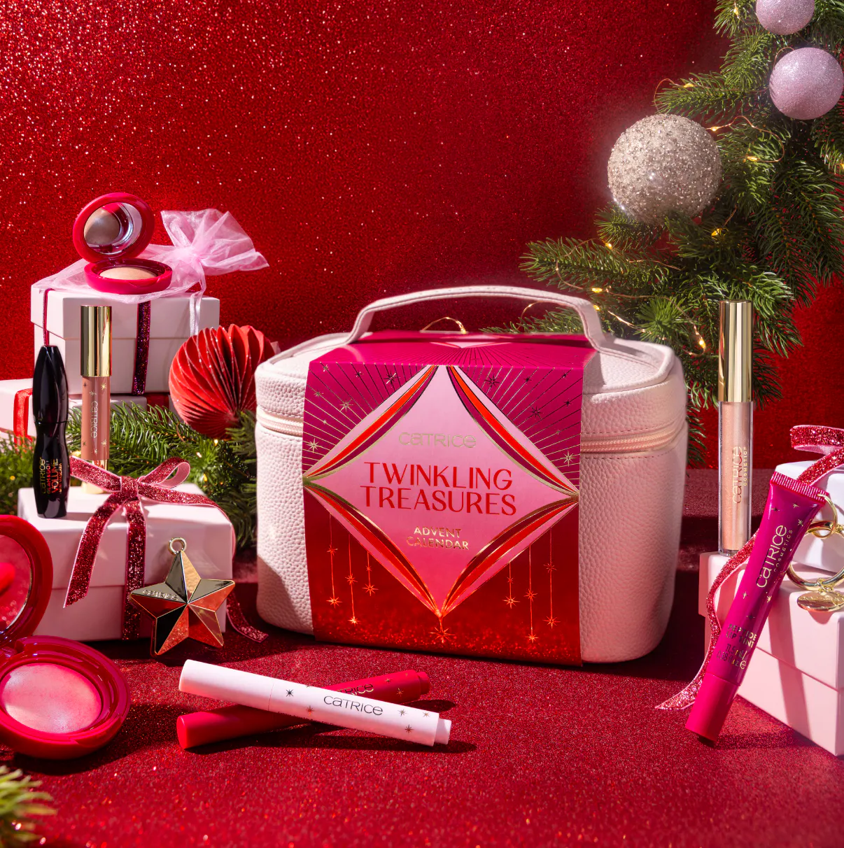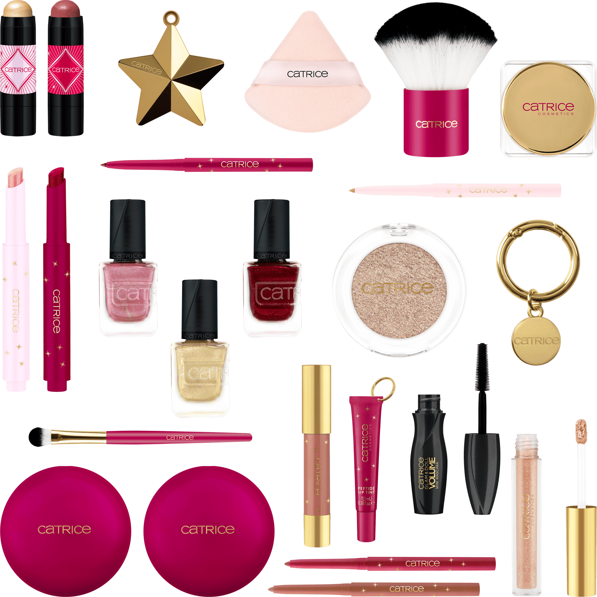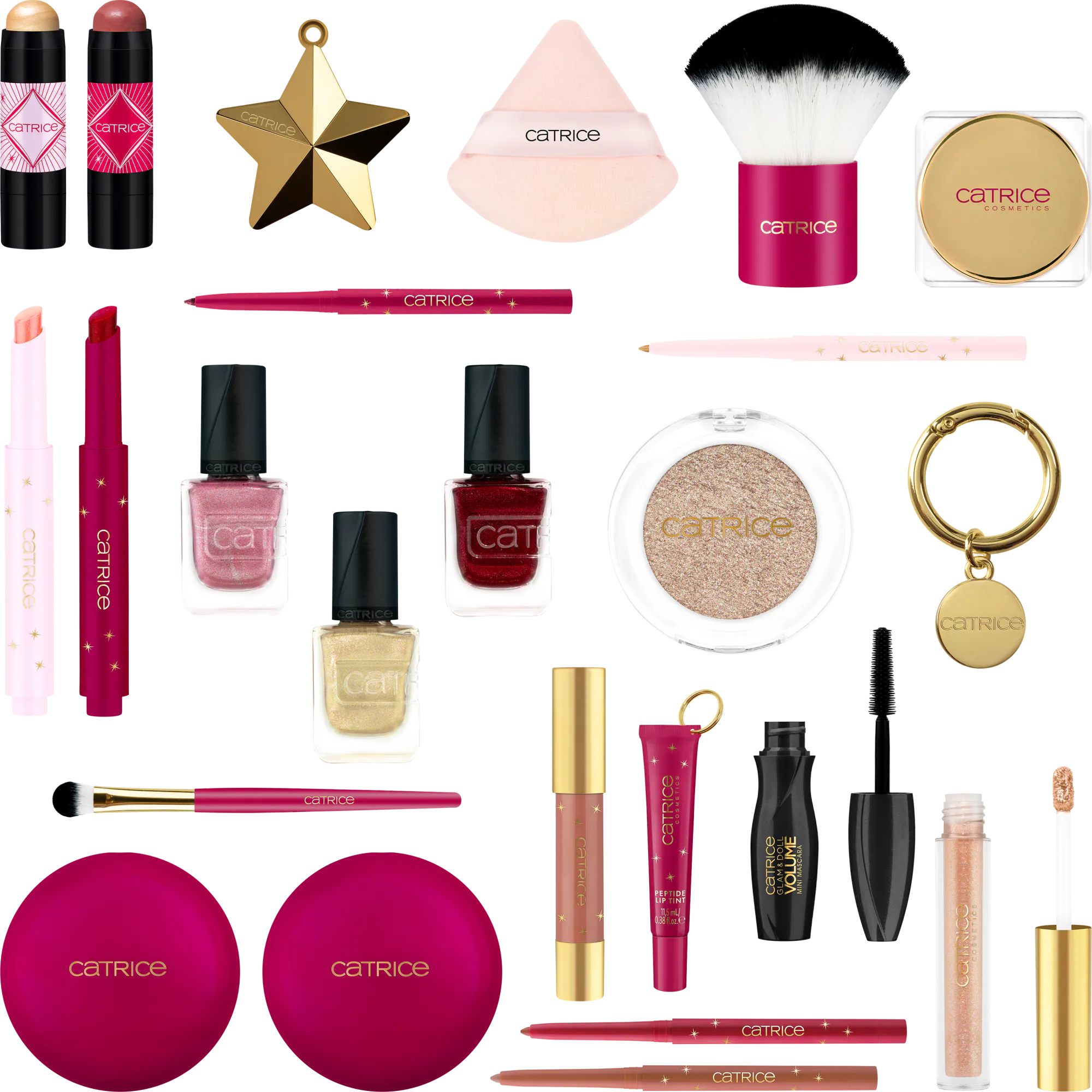 Catrice Eyepencil C01 Ruby Noel INGREDIENTS: ISODODECANE, TRIMETHYLSILOXYSILICATE, POLYMETHYLSILSESQUIOXANE, SYNTHETIC WAX, SYNTHETIC BEESWAX, PENTAERYTHRITYL TETRAISOSTEARATE, COPERNICIA CERIFERA CERA (COPERNICIA CERIFERA (CARNAUBA) WAX), CALCIUM SODIUM BOROSILICATE, EUPHORBIA CERIFERA CERA (EUPHORBIA CERIFERA (CANDELILLA) WAX), PROPYLENE CARBONATE, SYNTHETIC FLUORPHLOGOPITE, HYDROGENATED POLYCYCLOPENTADIENE, TRIHYDROXYSTEARIN, DISTEARDIMONIUM HECTORITE, CAPRYLYL GLYCOL, TRIETHOXYCAPRYLYLSILANE, ETHYLHEXYLGLYCERIN, ALUMINA, PHENOXYETHANOL, TIN OXIDE, CI 16035 (RED 40), CI 77491 (IRON OXIDES), CI 77499 (IRON OXIDES), CI 77891 (TITANIUM DIOXIDE). Catrice Eyepencil C02 Golden Eve INGREDIENTS: ISODODECANE, TRIMETHYLSILOXYSILICATE, POLYMETHYLSILSESQUIOXANE, CALCIUM SODIUM BOROSILICATE, SYNTHETIC WAX, SYNTHETIC BEESWAX, PENTAERYTHRITYL TETRAISOSTEARATE, EUPHORBIA CERIFERA CERA (EUPHORBIA CERIFERA (CANDELILLA) WAX), COPERNICIA CERIFERA CERA (COPERNICIA CERIFERA (CARNAUBA) WAX), MICA, PROPYLENE CARBONATE, HYDROGENATED POLYCYCLOPENTADIENE, TRIHYDROXYSTEARIN, DISTEARDIMONIUM HECTORITE, CAPRYLYL GLYCOL, ETHYLHEXYLGLYCERIN, PHENOXYETHANOL, TIN OXIDE, CI 77491 (IRON OXIDES), CI 77891 (TITANIUM DIOXIDE). Catrice Glam & Doll Volume Mini Mascara C01 Holly Glam INGREDIENTS: AQUA (WATER), COPERNICIA CERIFERA CERA (COPERNICIA CERIFERA (CARNAUBA) WAX), SYNTHETIC BEESWAX, BUTYLENE GLYCOL, STEARIC ACID, VP/EICOSENE COPOLYMER, PALMITIC ACID, ACACIA SENEGAL GUM, GLYCERYL STEARATE, PVP, AMINOMETHYL PROPANOL, EUPHORBIA CERIFERA CERA (EUPHORBIA CERIFERA (CANDELILLA) WAX), CAPRYLYL GLYCOL, PHENOXYETHANOL, SODIUM DEHYDROACETATE, BENZYL ALCOHOL, CI 77499 (IRON OXIDES). Catrice Jelly Eyeshadow Topper C01 Twinkling Crystal INGREDIENTS: AQUA (WATER), PROPYLENE GLYCOL, 1,2-HEXANEDIOL, SYNTHETIC FLUORPHLOGOPITE, GLYCERIN, CALCIUM ALUMINUM BOROSILICATE, AMMONIUM POLYACRYLOYLDIMETHYL TAURATE, AMMONIUM ACRYLOYLDIMETHYLTAURATE/VP COPOLYMER, PVP, HYDROXYACETOPHENONE, PHASEOLUS RADIATUS SEED EXTRACT, HYDROGENATED STARCH HYDROLYSATE, SUCROSE LAURATE, SILICA, BUTYLENE GLYCOL, XANTHAN GUM, CARBON, PARFUM (FRAGRANCE), VANILLIN, TIN OXIDE, CI 77000 (ALUMINUM POWDER), CI 77491 (IRON OXIDES), CI 77891 (TITANIUM DIOXIDE). Catrice Liquid Eyeshadow C01 Golden Treasure INGREDIENTS: AQUA (WATER), CALCIUM ALUMINUM BOROSILICATE, GLYCERIN, BUTYLENE GLYCOL, STYRENE/ACRYLATES COPOLYMER, SYNTHETIC FLUORPHLOGOPITE, ALOE BARBADENSIS LEAF EXTRACT, HAMAMELIS VIRGINIANA (WITCH HAZEL) WATER, MICA, AMMONIUM ACRYLOYLDIMETHYLTAURATE/VP COPOLYMER, POLYACRYLAMIDE, C13-14 ISOPARAFFIN (C13-14 ISOALKANE), ETHYLHEXYLGLYCERIN, LAURETH-7, CITRIC ACID, PHENOXYETHANOL, SODIUM DEHYDROACETATE, POTASSIUM SORBATE, SODIUM BENZOATE, SODIUM SULFITE, TIN OXIDE, CI 77491 (IRON OXIDES), CI 77891 (TITANIUM DIOXIDE). Catrice Mono Eyeshadow C01 Starlight Sparkle INGREDIENTS: TALC, SILICA, ISONONYL ISONONANOATE, CALCIUM ALUMINUM BOROSILICATE, DIMETHICONE, MICA, MAGNESIUM STEARATE, HYDROGENATED POLYISOBUTENE, TOCOPHERYL ACETATE, TOCOPHEROL, TRIMETHYLSILOXYSILICATE, DIMETHICONE/VINYL DIMETHICONE CROSSPOLYMER, ETHYLHEXYLGLYCERIN, PHENOXYETHANOL, TIN OXIDE, CI 77491 (IRON OXIDES), CI 77492 (IRON OXIDES), CI 77499 (IRON OXIDES), CI 77891 (TITANIUM DIOXIDE). Catrice Blush C01 Baked Apple Pink INGREDIENTS: SYNTHETIC FLUORPHLOGOPITE, HYDROGENATED POLYBUTENE, CALCIUM ALUMINUM BOROSILICATE, CAPRYLIC/CAPRIC TRIGLYCERIDE, POLYISOBUTENE, COPERNICIA CERIFERA CERA (COPERNICIA CERIFERA (CARNAUBA) WAX), EUPHORBIA CERIFERA CERA (EUPHORBIA CERIFERA (CANDELILLA) WAX), SYNTHETIC WAX, SILICA DIMETHYL SILYLATE, ETHYLHEXYLGLYCERIN, PHENOXYETHANOL, TIN OXIDE, CI 16035 (RED 40), CI 19140 (YELLOW 5), CI 77491 (IRON OXIDES), CI 77891 (TITANIUM DIOXIDE). Catrice Blush Stick C01 Candy Cane INGREDIENTS: OCTYLDODECANOL, CAPRYLIC/CAPRIC TRIGLYCERIDE, DIISOSTEARYL MALATE, ISOCETYL STEAROYL STEARATE, RICINUS COMMUNIS (CASTOR) SEED OIL, HELIANTHUS ANNUUS (SUNFLOWER) SEED WAX, EUPHORBIA CERIFERA CERA (EUPHORBIA CERIFERA (CANDELILLA) WAX), TAPIOCA STARCH, BIS-DIGLYCERYL POLYACYLADIPATE-2, C10-18 TRIGLYCERIDES, SODIUM HYALURONATE, TOCOPHEROL, HELIANTHUS ANNUUS (SUNFLOWER) SEED OIL, SILICA, DIETHYLHEXYL SYRINGYLIDENEMALONATE, ASCORBYL PALMITATE, HYDROGENATED CASTOR OIL, CITRUS AURANTIUM PEEL OIL, LIMONENE, PARFUM (FRAGRANCE), VANILLIN, CI 15850 (RED 7 LAKE), CI 77491 (IRON OXIDES), CI 77492 (IRON OXIDES), CI 77499 (IRON OXIDES), CI 77891 (TITANIUM DIOXIDE). Catrice Charm Ring C01 Christmas Charms Catrice Eyeshadow Brush C01 Midnight Glamour Catrice Highlighter C01 Holly Jolly Shine INGREDIENTS: SYNTHETIC FLUORPHLOGOPITE, HYDROGENATED POLYBUTENE, CAPRYLIC/CAPRIC TRIGLYCERIDE, CALCIUM ALUMINUM BOROSILICATE, POLYISOBUTENE, MICA, COPERNICIA CERIFERA CERA (COPERNICIA CERIFERA (CARNAUBA) WAX), EUPHORBIA CERIFERA CERA (EUPHORBIA CERIFERA (CANDELILLA) WAX), SYNTHETIC WAX, SILICA DIMETHYL SILYLATE, ETHYLHEXYLGLYCERIN, PHENOXYETHANOL, TIN OXIDE, CI 16035 (RED 40), CI 19140 (YELLOW 5), CI 77491 (IRON OXIDES), CI 77891 (TITANIUM DIOXIDE). Catrice Highlighter Glow Stick C01 Glow Ho Ho INGREDIENTS: OCTYLDODECANOL, CAPRYLIC/CAPRIC TRIGLYCERIDE, DIISOSTEARYL MALATE, ISOCETYL STEAROYL STEARATE, RICINUS COMMUNIS (CASTOR) SEED OIL, MICA, HELIANTHUS ANNUUS (SUNFLOWER) SEED WAX, EUPHORBIA CERIFERA CERA (EUPHORBIA CERIFERA (CANDELILLA) WAX), TAPIOCA STARCH, BIS-DIGLYCERYL POLYACYLADIPATE-2, C10-18 TRIGLYCERIDES, SODIUM HYALURONATE, TOCOPHEROL, HELIANTHUS ANNUUS (SUNFLOWER) SEED OIL, SILICA, DIETHYLHEXYL SYRINGYLIDENEMALONATE, ASCORBYL PALMITATE, HYDROGENATED CASTOR OIL, BENZYL ALCOHOL, PARFUM (FRAGRANCE), TIN OXIDE, CI 77491 (IRON OXIDES), CI 77891 (TITANIUM DIOXIDE). Catrice Kabuki Brush C01 Festive Feeling Catrice Make Up Bag C01 Twinkling Treasures Box Catrice Powder Puff C01 Touch of Treasure Catrice Juicy Lip Balm C01 Champange Fizz INGREDIENTS: OCTYLDODECANOL, POLYBUTENE, TRIDECYL TRIMELLITATE, DIISOSTEARYL MALATE, PHYTOSTERYL ISOSTEARATE, BIS-DIGLYCERYL POLYACYLADIPATE-2, EUPHORBIA CERIFERA CERA (EUPHORBIA CERIFERA (CANDELILLA) WA