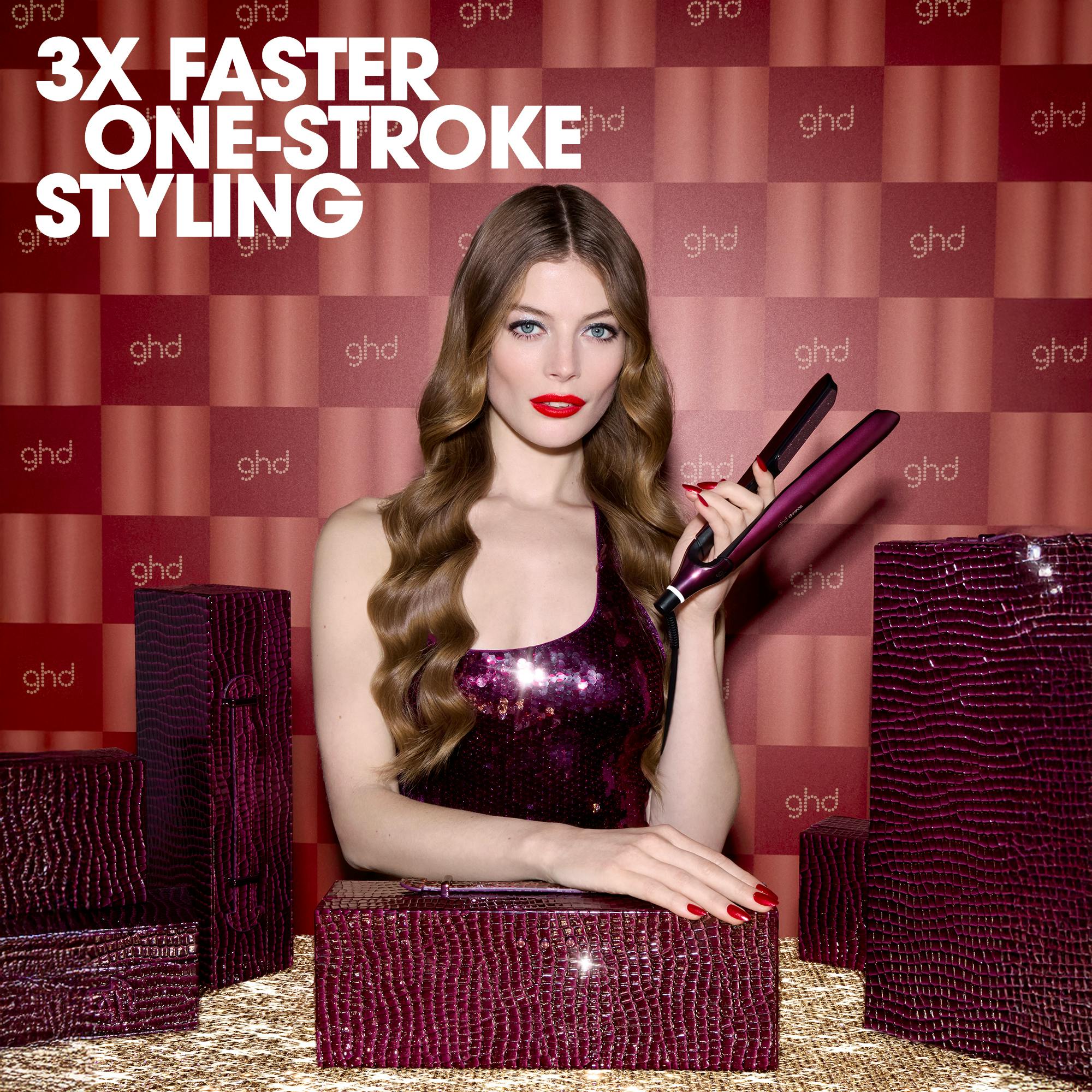 De ghd Chronos Limited Edition Gift Set - Hair Straighteners in Cherry Chic is een professioneel stylingapparaat dat schoonheid en technologie combineert in een elegant ontwerp. Deze limited edition stijltang, gehuld in een rijke kersenrode tint, maakt deel uit van de ghd Cherry Chic collectie en viert luxe esthetiek en tijdloze charme. Dankzij de geavanceerde HD Motion-Responsive technologie past het apparaat zich intuïtief aan jouw stylingbewegingen aan en behoudt het met precisie de optimale stylingtemperatuur van 185°C. De hoogwaardige keramische platen met een ultra-glanzende afwerking zorgen voor glad en gepolijst haar met slechts één beweging, wat tot 85% meer glans en langdurige resultaten biedt.